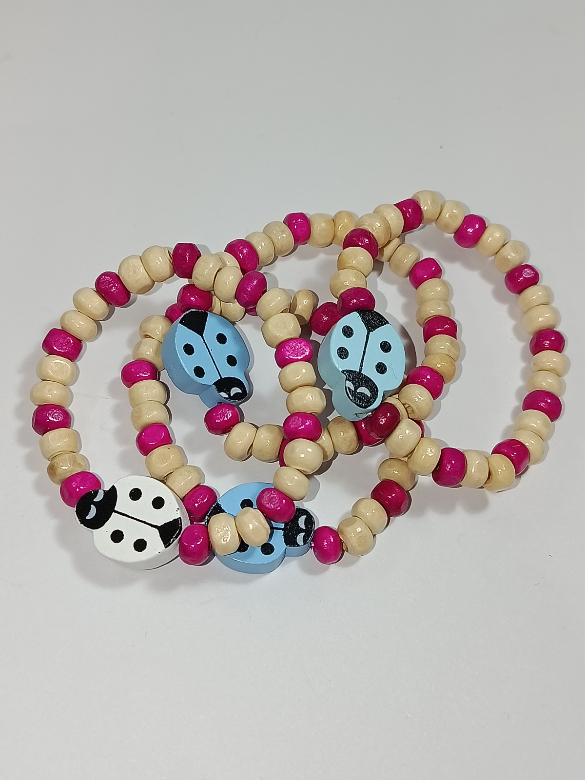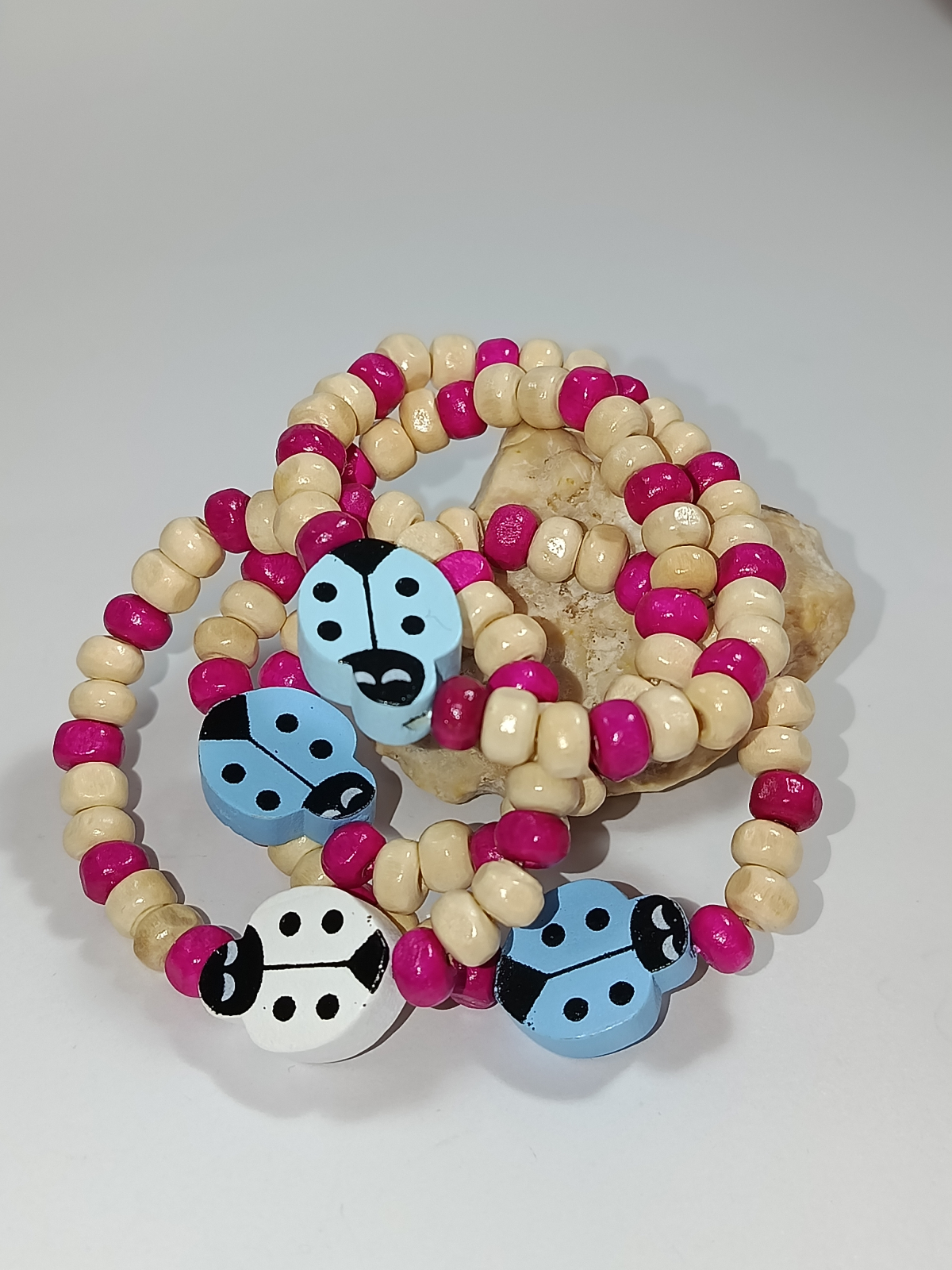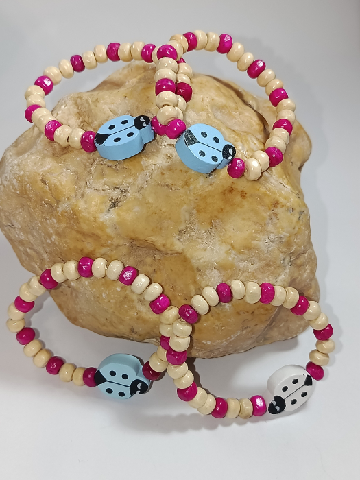 Elementul central este un charm gărgăriță din lemn, pictat în culori vibrante (bleu sau alb), care adaugă o notă ludică și plină de farmec fiecărei brățări. Fiind montate pe un fir elastic rezistent, brățările sunt ușor de pus și de scos, adaptându-se perfect pe încheietura celor mici. Este un mărțișor handmade durabil, care poate fi purtat ca o bijuterie preferată tot timpul anului.