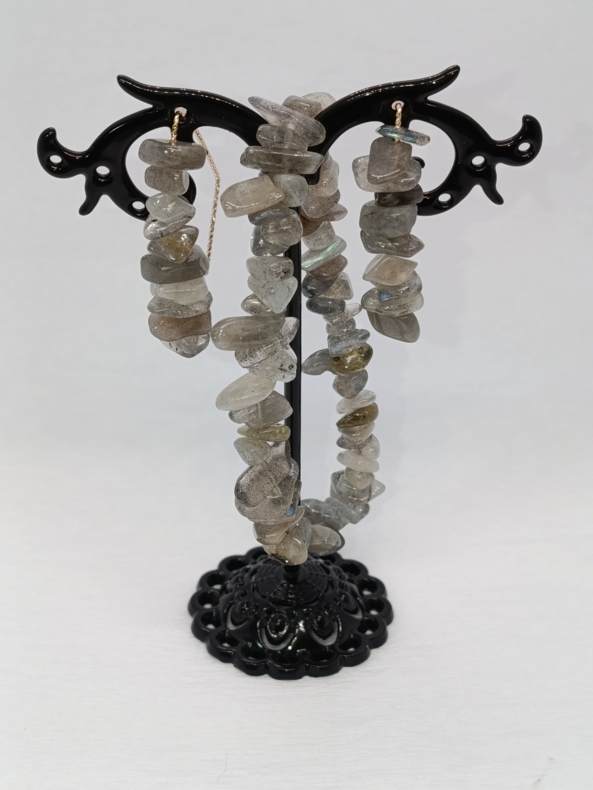 Brățara: Realizată dintr-un șir de pietre de labradorit înșirate pe un elastic rezistent. Pietrele, cu formele lor neregulate, reflectă o paletă subtilă de culori, de la griuri fumurii la nuanțe translucide, care prind viață la cea mai mică mișcare. Cu o lungime de 17-19 cm, brățara este confortabilă și se adaptează perfect pe încheietură.