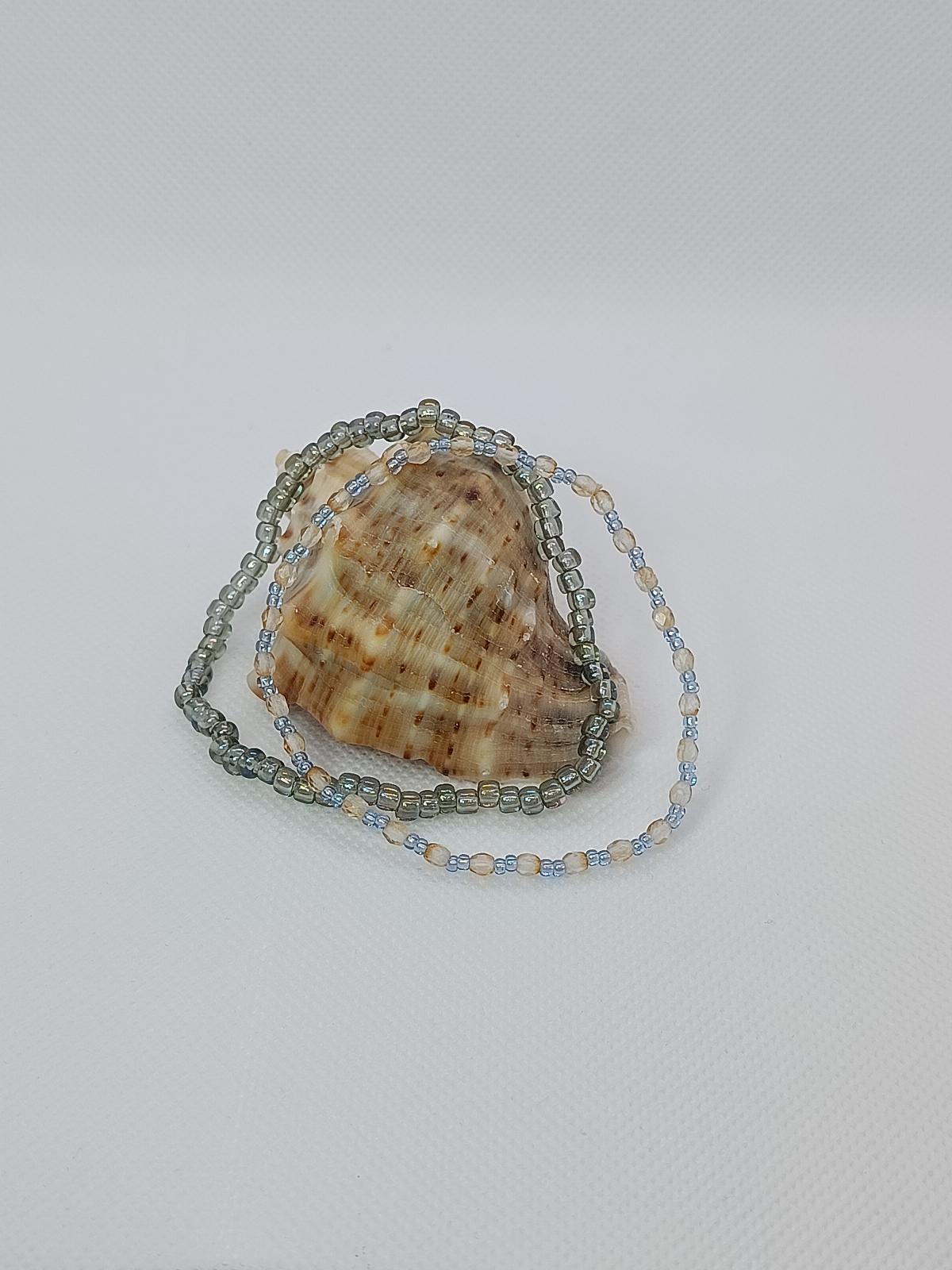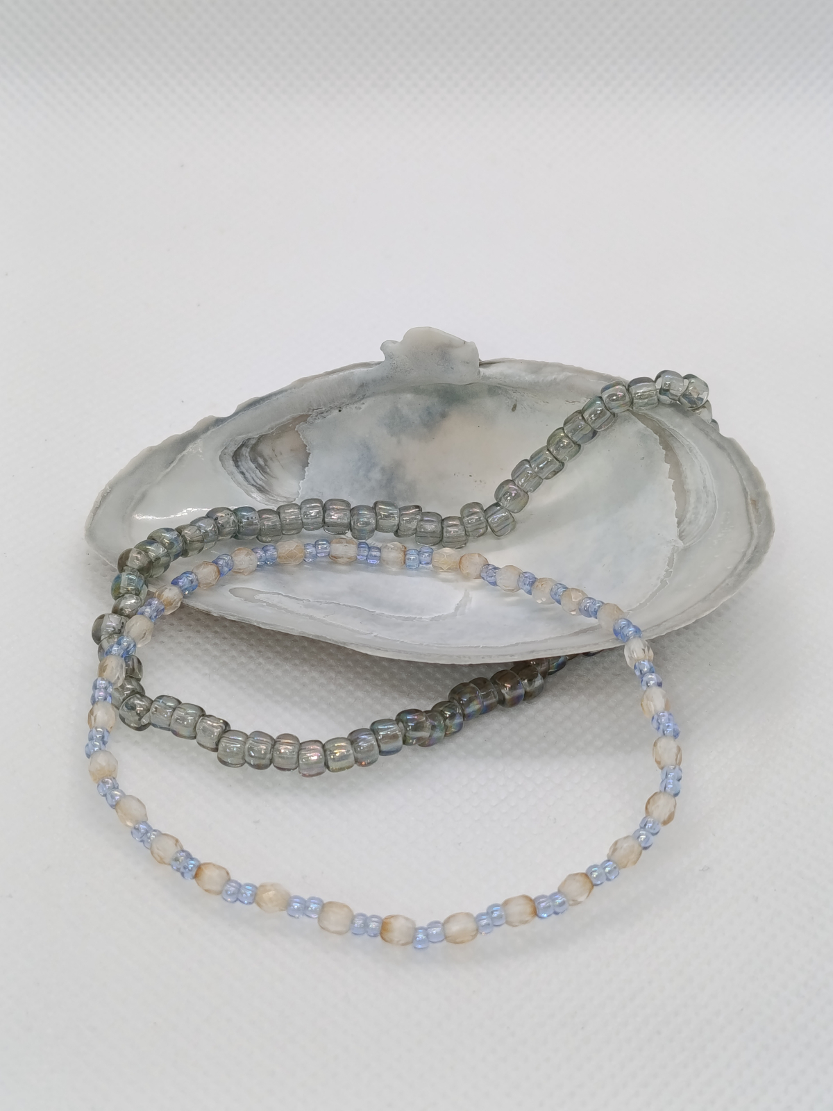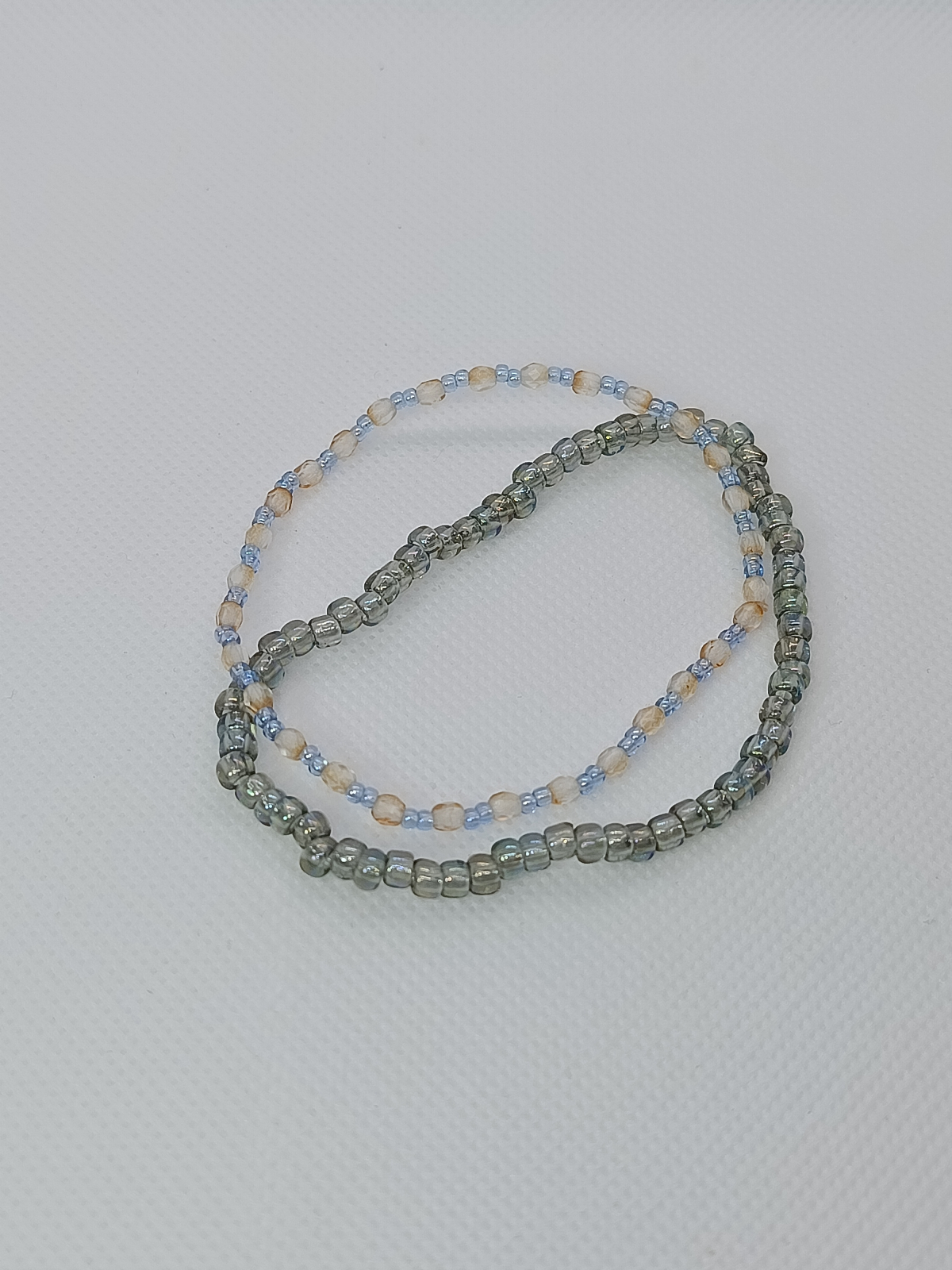 Acest set de două brățări handmade este realizat cu migală în România, din mărgele Toho fine, în nuanțe delicate de nude, albastru pastel și gri irizat. Designul lor minimalist, dar expresiv, evidențiază frumusețea detaliului discret, aducând un plus de feminitate oricărei ținute.